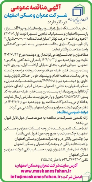 آگهی مناقصه عمومی شرکت عمران و مسکن اصفهان در نظر دارد: خرید5 دستگاه دیزل ژنراتور پروژههای لیلیوم و B9 شیراز، پارسینا اصفهان و سمبلیک شاهینشهر(نوبت اول 01/1404) *نحوه پرداخت 100...